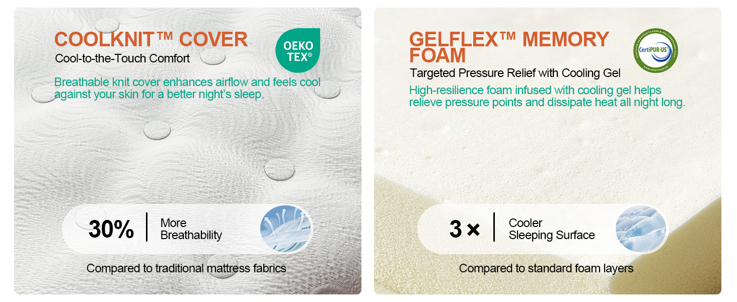 【COOL & BREATHABLE FOR DREAMY NIGHTS】Say goodbye to overheating! Our gel air memory foam and breathable knitted fabric create a refreshing sleep environment, so you wake up feeling rested, not restless.